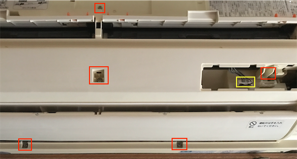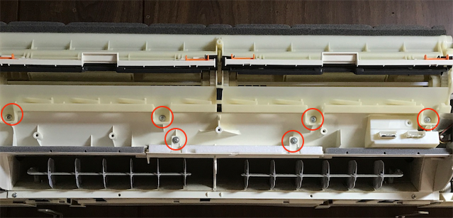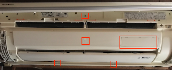 以下の5箇所の部分にあるネジを外します。一番上のものはフィルターカバーの下にあるので、フィルターカバーの両端にある指掛部を持って引き上げて開けてください。下4箇所はカバーがあるので、真ん中の2つは凹みにマイナスドライバーを入れて外します。下の2つは回転させる感じで押し込むと外れると思います。
