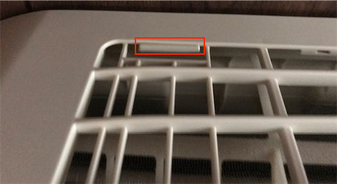 ルーバー真ん中の部分(赤四角)を前に引き出しながら噛み合っているのを外します。壊れないか結構ビクビクしながら引っ張りました。
