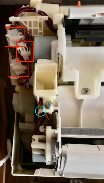 左側の3箇所のコネクタ(赤色で囲んだ部分)を外します。