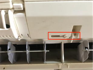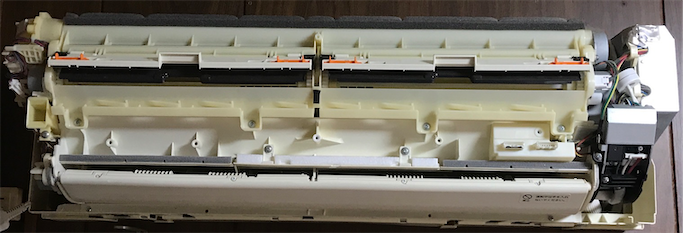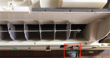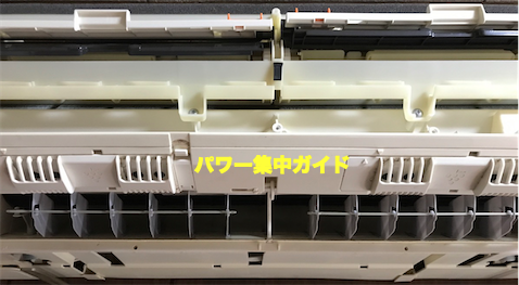 次の日に再度、パワー集中ガイドを外すところまで分解。前回モーターを外しましたが、今回はモーターは外さずにパワー集中ガイドだけを引き抜き、印はないものの、モーターと噛み合わせるギザキザの部分で、なんとなくここかもというところにパワー集中ガイドを取り付けて、祈るような気持ちで冷房開始。今度はパワー集中ガイドがちゃんと開いています。!