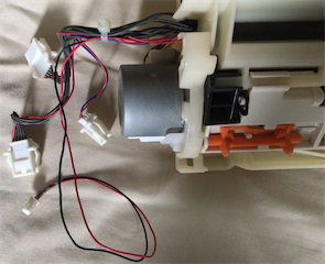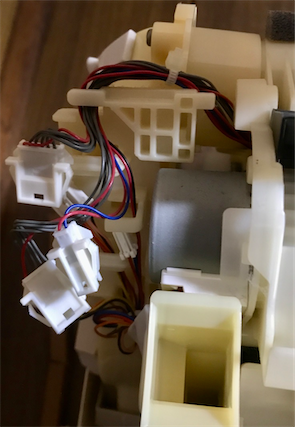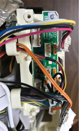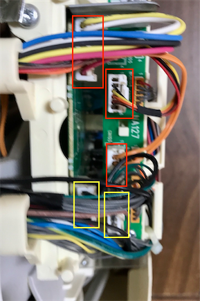 カバーを外します。上の奥に引っ掛かりがあるのでそれを外してから手前に引いてください。参考したページに書かれていた5箇所のコネクタを外します。(組み立て時に気がついたのですが、もしかしたら黄色の2箇所だけで大丈夫だったような気がします。)