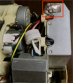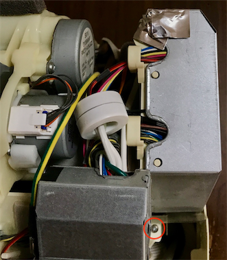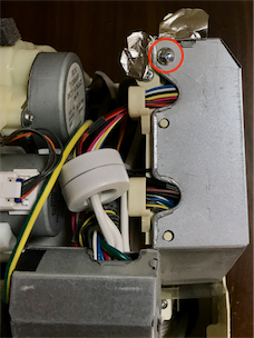 左側下にあるモーターを外します。(これももしかしたら外さなくてもよかったのかもしれません。)ネジは4つの内、外側の2つになります。
