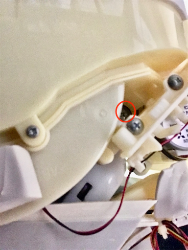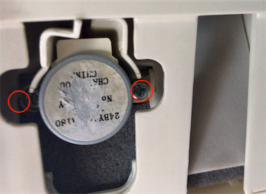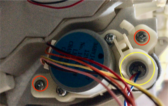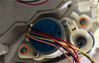 左右なめらかガイド(ルーバー)用モーターを外します。下から見ると左右1箇所ずつモーターが付いているので、ネジを外します。