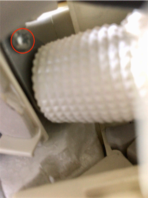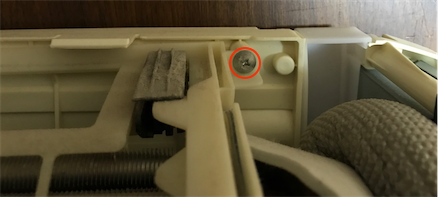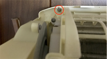 左右なめらかガイド(ルーバー)を外します。(これも肝心な画像がありません。参考ページをご覧ください。)赤丸部分のネジ2箇所を外します。