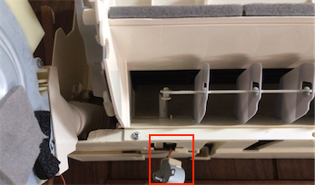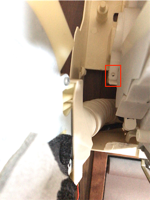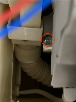 右下にあるドレンホースを外します。このネジの位置が大変意地悪です。下の後ろ側からじゃないと見えません。なのでドライバー入りません。フレキシブルドライバーのよっぽど柔軟なものじゃないとダメだと思います。私はプラスのドライバービットをラジオペンチで挟んで回し、緩くなったら指でドライバービットを回して外しました。