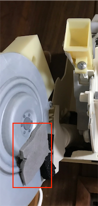 左側のモーターの穴の中(画像黄色丸)を電源コードが通っているので、電源コードを引き抜きながらパワー集中ガイドを外してください。