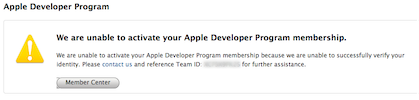 案の定、「We are unable to activate your Apple Developer Program membership」となってしまいました。