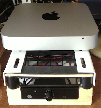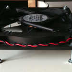 Mac miniを購入した際に、夏に向けて冷却用送風装置を作成したのですが、フレームにぶら下げていたので、ファンからの振動がフレームに伝わってしまっていました。