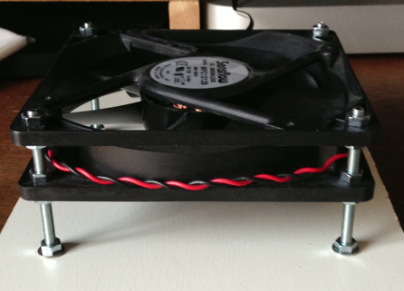 薄いベニヤ板にネジ(M4 x 60mm)を4本挿して、そこにファンを固定する方法をとりました。