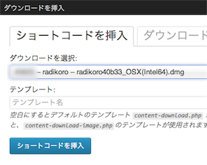 で、投稿記事の「ダウンロードを挿入」(テキストエディタの場合)ボタンを押して、ショートコードを挿入タブにて、ダウンロードを選択のポップアップメニューよりダウンロードするファイルを選択、テンプレートフィールドは、デフォルトのテンプレートを使う場合は空白のまま、先ほど設定したデフォルトのテンプレート以外を使う場合はテンプレート名を入力して、「ショートコードを挿入」ボタンをクリック。これでOK。