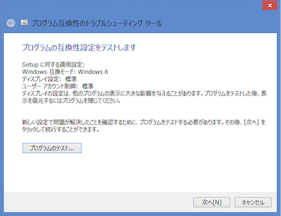「推奨設定を使用する」 »「プログラムの互換性設定をテストします。」 »「プログラムのテスト」を実行したところ、インストールができました。 :surprised_wp: