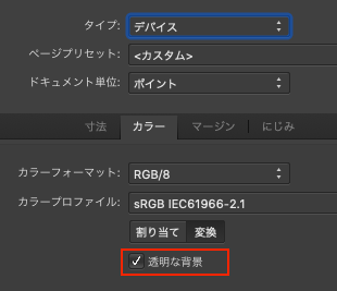 アイコンの背景を透過して書き出すには、「ファイル」メニューから「ドキュメント設定」を選択して、「カラー」タブの「透明な背景」にチェックを入れて「OK」をクリック