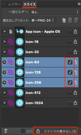 次に、スライスパネルで書き出したいアイコンにチェックを入れて(例では64,128,256)