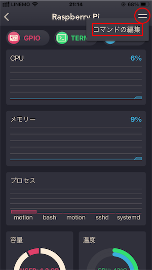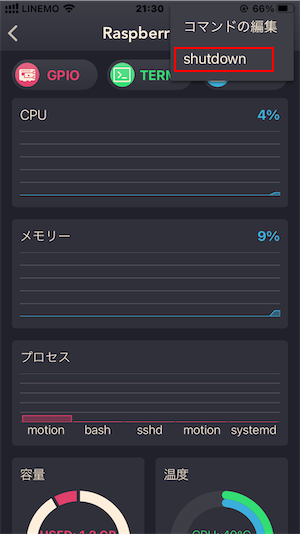 右上三本線をタップすると、作成したカスタムコマンドが選択できるようになっているので、選択すると「sudo shutdown -h now」が実行され、Raspberry Piを終了することができます。