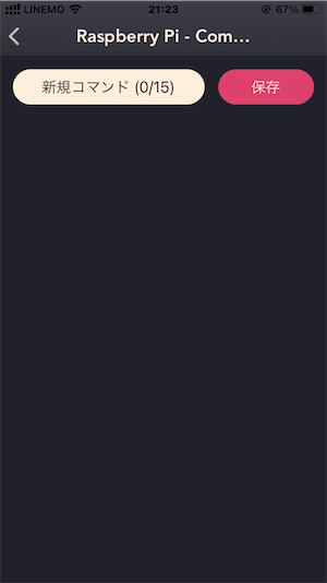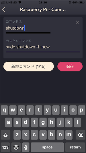 コマンド名をshutdown、カスタムコマンドを「sudo shutdown -h now」と入力して「保存」をタップ