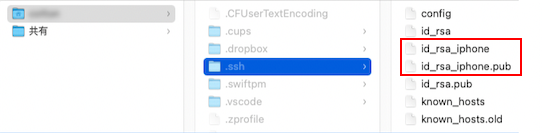 公開鍵(id_rsa_iphone.pub)と秘密鍵(id_rsa_iphone)が生成されていればOKです。