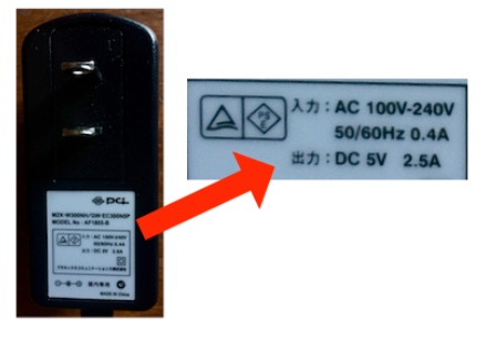 ただ、Anker PowerPort 5は他の充電に使っているものなので、なんとかならないかと、押入れに取ってあった大量のACアダプタを探したところ、運良く2.5AのACアダプタが出て来ました。(プラネックスとなっているので、ルータに付属していたもの)