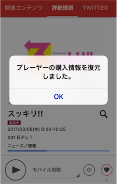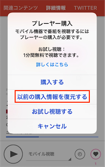 アプリに戻って、適当な番組の再生をすると表示される、プレイヤー購入画面で、「以前の購入情報を復元する」をタップすると