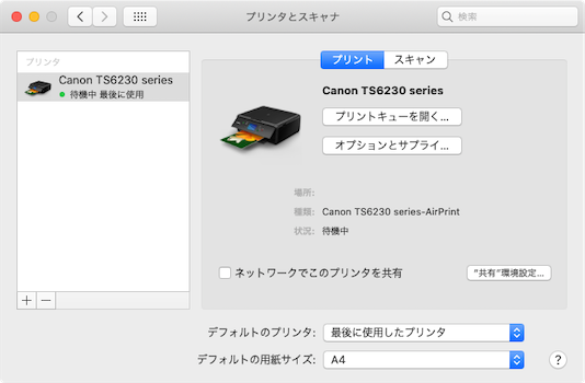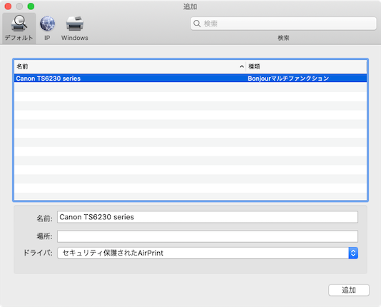 早速、 Wi-Fi接続しているTS6230の電源を入れて、システム環境設定 » プリンタとスキャナで左下の「+」ボタンを押して、しばらく待っていると「セキュリティ保護された AirPrint」なるものが現れました。