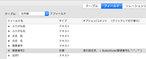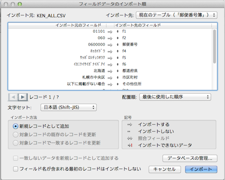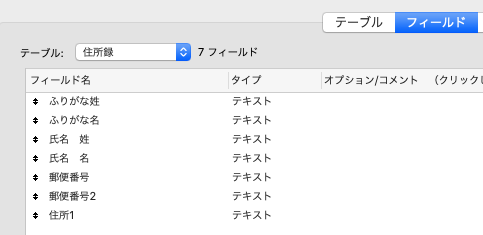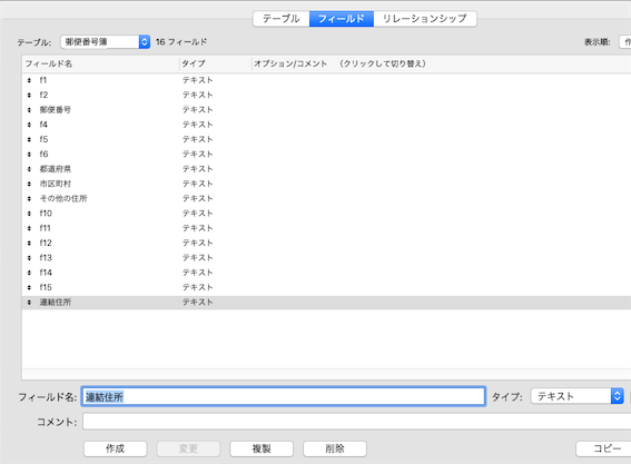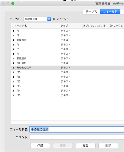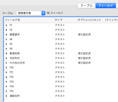 読み込んだら、「ファイル」メニューから、「管理」»「データベース…」を選択。テーブルタブにてテーブル名を「KEN_ALL」から「郵便番号簿」に変更。「フィールド」タブにてフィールド名を分かりやすいように変更します。f3を郵便番号、f7を都道府県、f8を市区町村、f9をその他の住所に