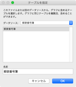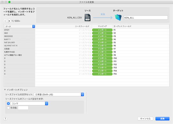 オープンダイアログで「表示」ポップアップメニューより「コンマ区切り値」を選び、解凍した「KEN_ALL.CSV」を指定して読み込みます。データベース名は「郵便番号簿」とします
