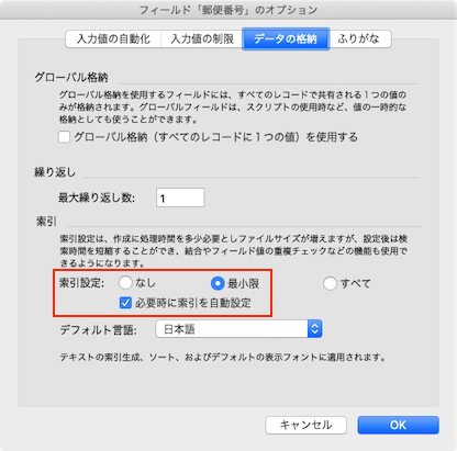 設定するフィールド名を選択したら、右下の「オプション」ボタンをクリック。「データの格納」タブにて、索引設定の最小値ラジオボタンと「必要時に索引を自動設定」を選択して「OK」ボタンをクリック