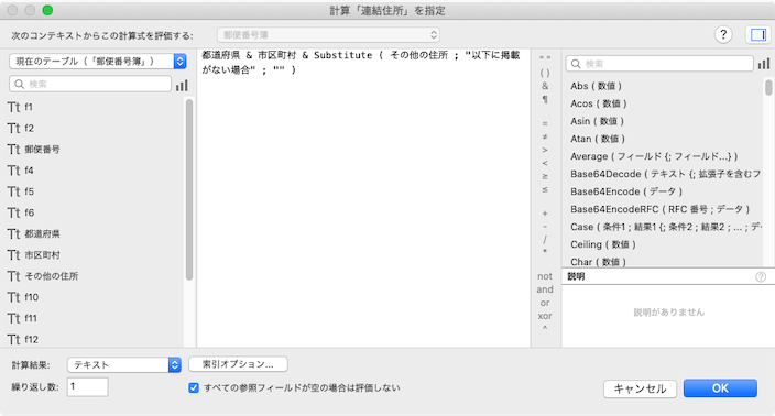 計算「連結住所」を指定ウインドウにて、以下の計算式を入力したら、「OK」ボタンをクリック。