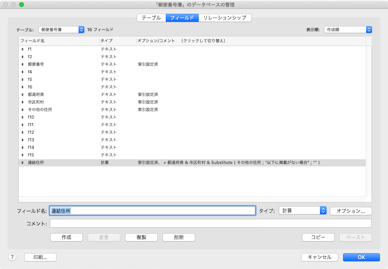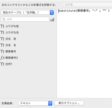 郵便番号は表示用にハイフンありとします。その為、郵便番号簿からデータを取得するためにハイフンを取り除いた郵便番号2を利用します。「ファイル」メニュー →「管理」→「データベース」→「フィールド」タブにて、郵便番号2を選択して、タイプ「計算」を選び、「変更」ボタンをクリック。確認ダイアログが表示されるので、「OK」ボタンをクリック。