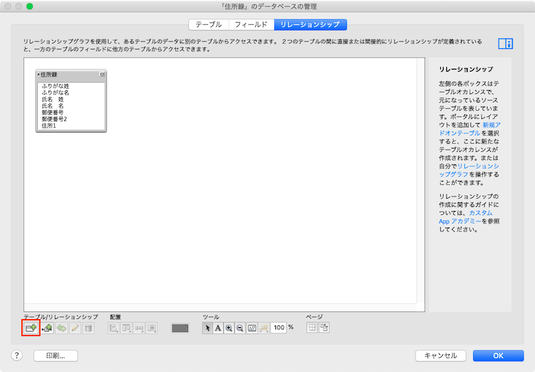 「ファイル」メニュー →「管理」→「データベース」→「リレーションシップ」タブにて、左下の「テーブルを追加」ボタンをクリックして、「データソース」ポップアップメニューで「郵便番号簿」を指定。もし郵便番号簿がなければ、「FileMakerデータソースの追加」を選択して郵便番号簿の場所を指定。認証ダイアログが表示されたら、内容を確認のうえ「はい」ボタンをクリック。