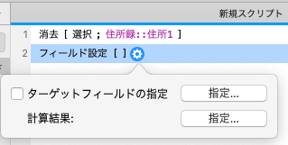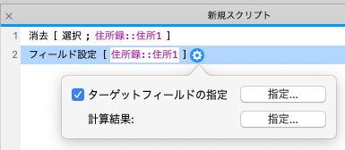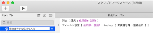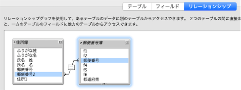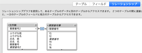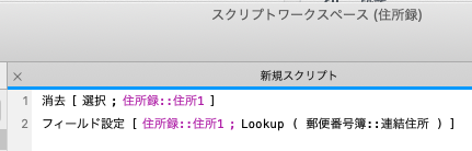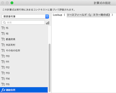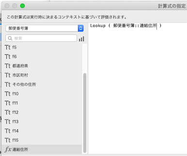 フィールド設定 [ 住所録::住所1 ; Lookup( 郵便番号簿::連結住所 )] となります。