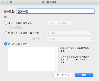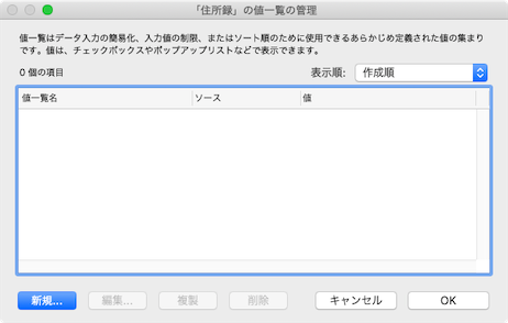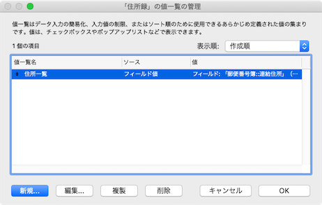 「ファイル」メニュー → 「管理」→ 「値一覧」を選び、「新規」ボタンをクリック。値一覧名は「住所一覧」に