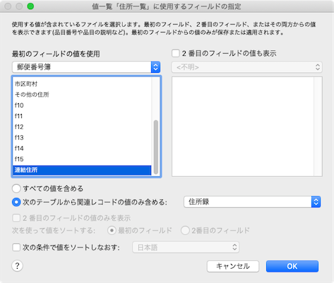 「最初のフィールドの値を使用」ポップアップメニューにて、「郵便番号簿」を選択。リストにて「連結住所」を選択