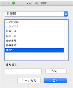 「フィールド指定」ウインドウのポップアップメニューより「住所録」を選択して、下のリストから「住所1」フィールドを選択