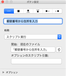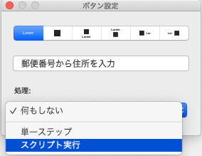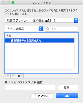 左のリストで、「制御」内の「スクリプト実行」を選択、開いた 「スクリプト設定」ウインドウにて、2.で作成したスクリプト「郵便番号から住所を入力」を選択して、「OK」ボタンをクリック