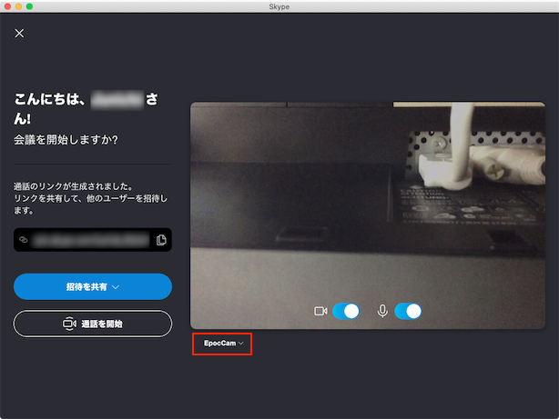 ここでは Skypeで動作確認します。Macで Skypeを起動したら、「会議」をクリック。問題なければiPhoneで写している映像が表示されます。(映像下に EpocCamが選択されているのを確認してください)