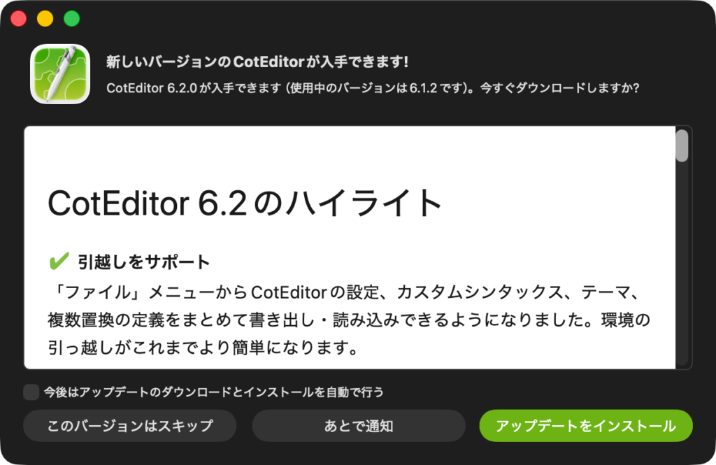 「CotEditor 6.2.0」(non-AppStore版)が公開 Mac 2025.12.14 アーカイブ – CotEditorのページにて、エディタの「CotEditor 6.2.0」(non-AppStore版)が公開されていました。 リリースノート