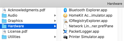 Bluetooth Explorerアプリを入手するには、Xcode 12を起動して、アプリケーションメニューより、「Open Developer Tool」»「More Developer Tools …」を選択すると、ブラウザでMore Downloads for Apple Developersのページが開く(要ログイン)ので、左のCATEGORIESでDeveloper Toolsのみにチェックを入れて、Additional Tools for Xcode 11.4をダウンロードしてください。(Additional Tools for Xcode 12には含まれていません)