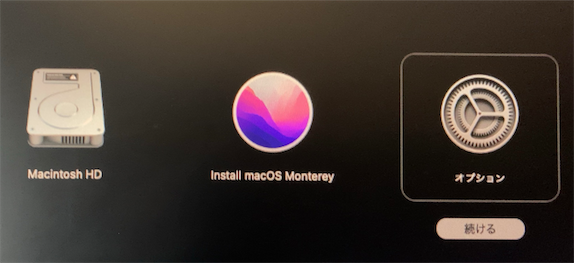 インストール用に作成したUSBメモリ「Install macOS Monterey」が刺さったままの状態でした。通常はMacintosh HDとオプションの2つです。