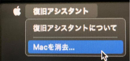「復旧アシスタント」メニューから「Macを消去…」を選択します。