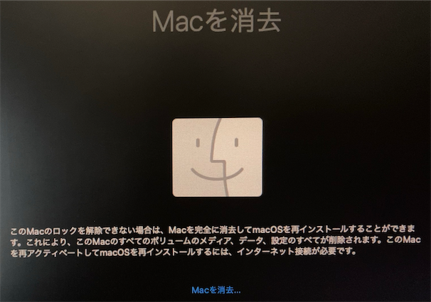 「このMacを再アクティベートしてmacOSを再インストールするには、インターネット接続が必要です。」と表示されます。ネットに接続していることを確認して、問題なければ、「Macを消去…」をクリックします。