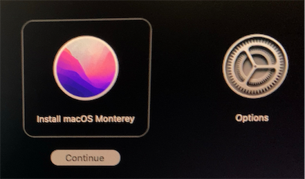 電源ボタンを押し続けると以下のような表示になるので、「Install macOS Monterey」を選択して、「Continue」をクリックします。