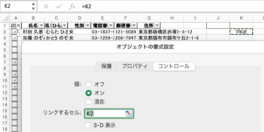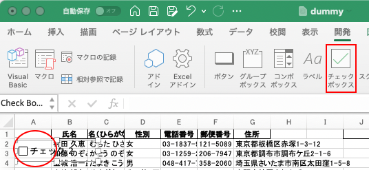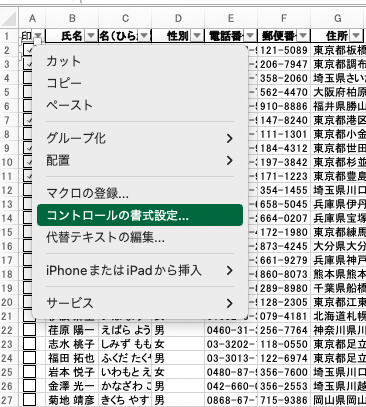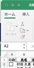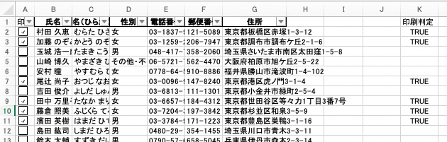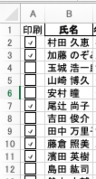 印刷するものを分けるために、前回(WordとExcelで住所録一覧を印刷 | MacFeeling Blog)のものにチェックボックスを追加してみます。