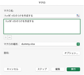 作成したらウインドウを閉じて元に戻って、念の為マクロの場所でExcelファイルを指定して、「実行」ボタンをクリック。
