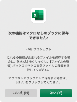 「次の機能はマクロなしのブックに保存できません。」と言われるので、今回はそのまま「はい」をクリックでマクロなしで保存してください。