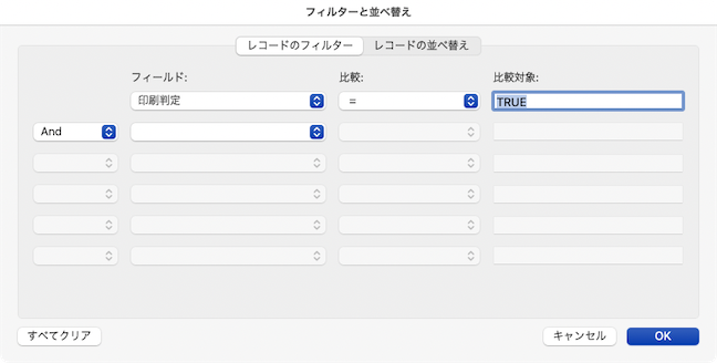 「差し込み文書」タブ »「宛先のフィルター」を選択して、印刷判定=TRUEにすれば、印刷チェックボックスにチェックを入れたもののみを抽出することができます。(ひとつ以上TRUEがないとエラーになるので、ひとつ以上チェックボックスにチェックを入れてください。)