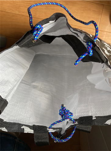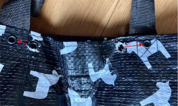 このままだといずれ裂けてしまうので、取手がついている他よりは丈夫そうな箇所に穴を開け直しました。