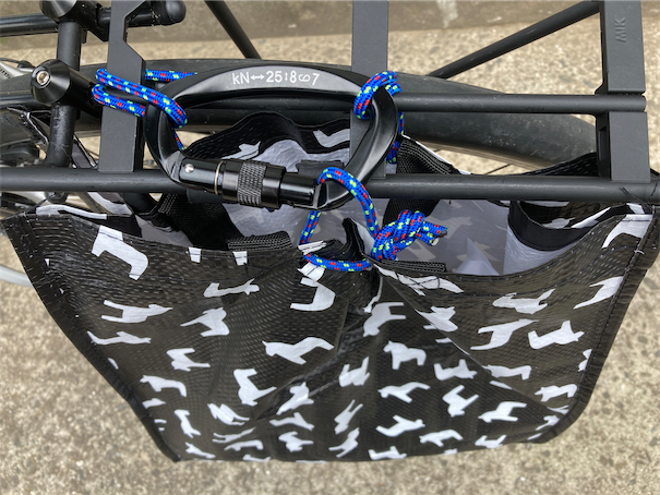 これをリアキャリアにこんな感じでカラビナで固定しました。どの程度耐えられるか分かりませんが…