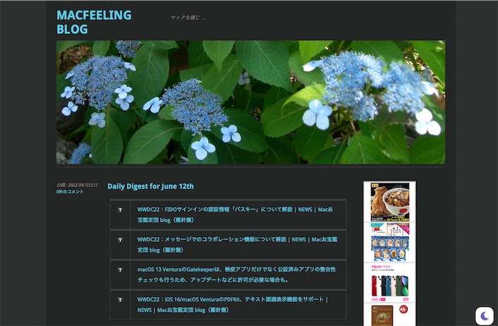 Macをダークモードにしている時に、当ブログも自動でダークモード表示にするために、WP Dark Mode – WordPress プラグイン | WordPress.org 日本語を導入してみました。 SafariとChromeで自動的に切り替わることを確認しました。(細かいところは未確認)
