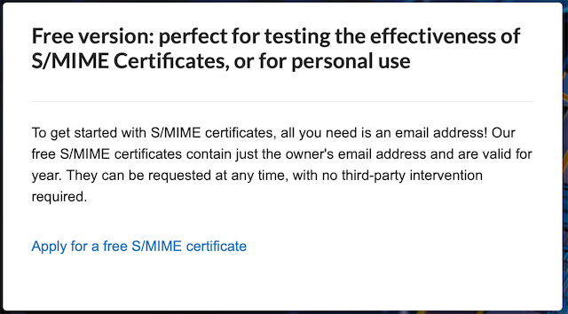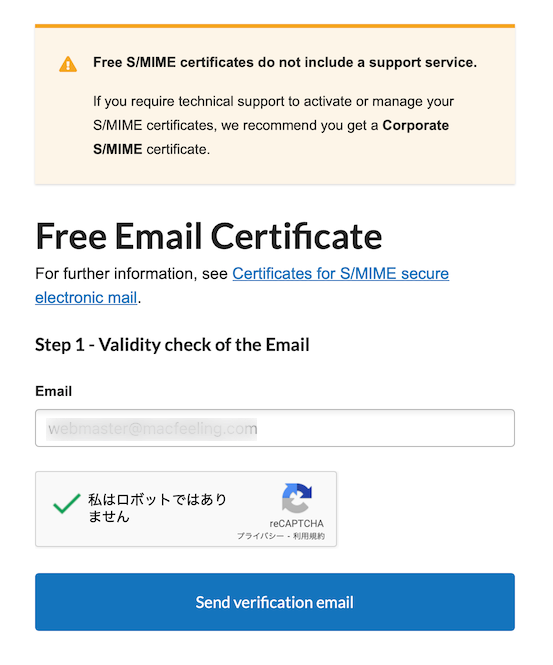 ここからはMacで行っています。S/MIME certificates from Actalis | Actalis.comのページへ行って、Free version: にあるApply for a free S/MIME certificateのリンクをクリック