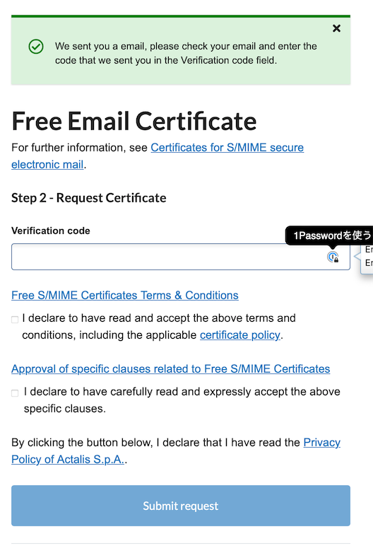 登録したメールアドレス宛に、「Conferma validità indirizzo Email – Email Address validity confirmation」というタイトルでメールが届くので、その中に記載されているVerification Codeをコピーして、Step 2 – Request CertificateのVerification codeにペーストして、「Submit request」をクリック